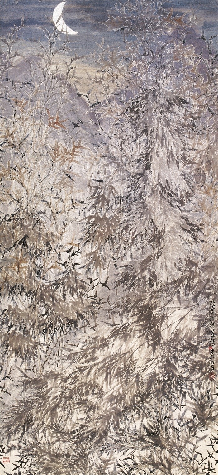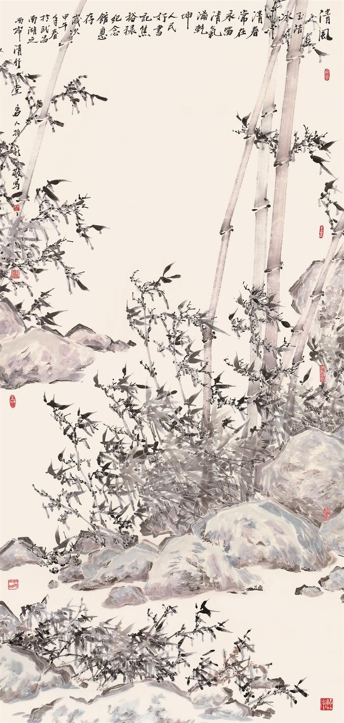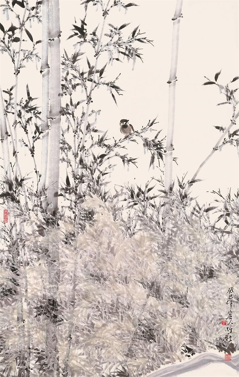 通过30多年的绘画实践,冰竹已然成为尹维新的一种创造,也是他的胆识与水墨技法的集中体现,具有一种继承与发展的意味。他用与众不同的眼光、新的笔墨创造,展现着冰竹所蕴含的特殊禅意,显得清净、清新与淡雅。