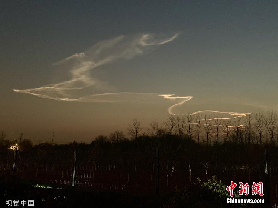 12月7日,中国在太原卫星发射中心用快舟一号甲运载火箭,“一箭六星”将卫星发射,其尾迹被太阳余晖照亮。由于高度极高,北京也能看到火箭升空后留下的航迹云。图片来源:视觉中国