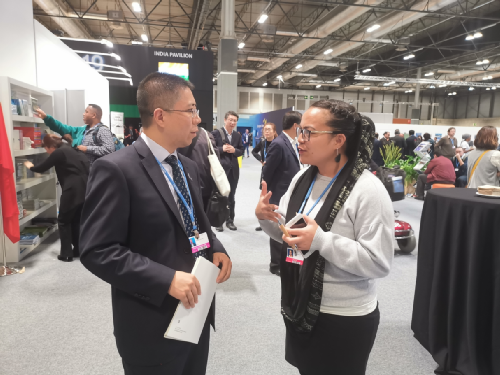 边会期间,与来自太平洋群岛国家的与会代表交流。
