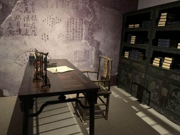 在观展过程中,观众还可以通过VR技术,走进书中的大观园,营造真实与虚拟相结合的丰满视觉效果。曹雪芹西山故居书房进行1:1复原,呈现曹雪芹创作《红楼梦》的场景。11米的书墙构成的长廊展出了《红楼梦》相关著作近400件套,让观众更真切的感受到《红楼梦》的文化魅力。