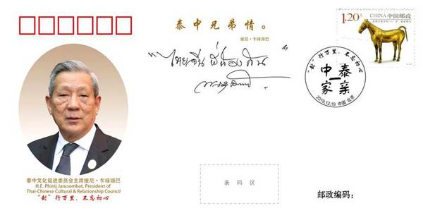 披尼·乍禄颂巴先生对“‘封’行万里 不忘初心”项目这种通过小小的纪念封推动民间文化交流、促进两国友好交往、推动两国人民民心相通的形式给予了高度评价。他说,中国的发展方向与时代的发展方向一致,这不仅能为中国带来辉煌成就,同时也为全球带来更多的机会。希望未来继续致力于泰中友好,也希望在2020年中泰建交45周年之际能看到中国-泰国纪念封的出现。披尼·乍禄颂巴为两国友好题词“泰中兄弟情”。