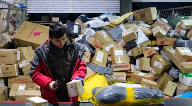 山东省潍坊市一家快递公司分拣中 心,工作人员在分拣货件 张驰/摄