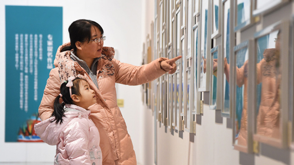 第二届“全民美育·诗歌的样子”儿童优秀美术作品年度展在北京举行。家长带领小朋友参观展览任超/摄