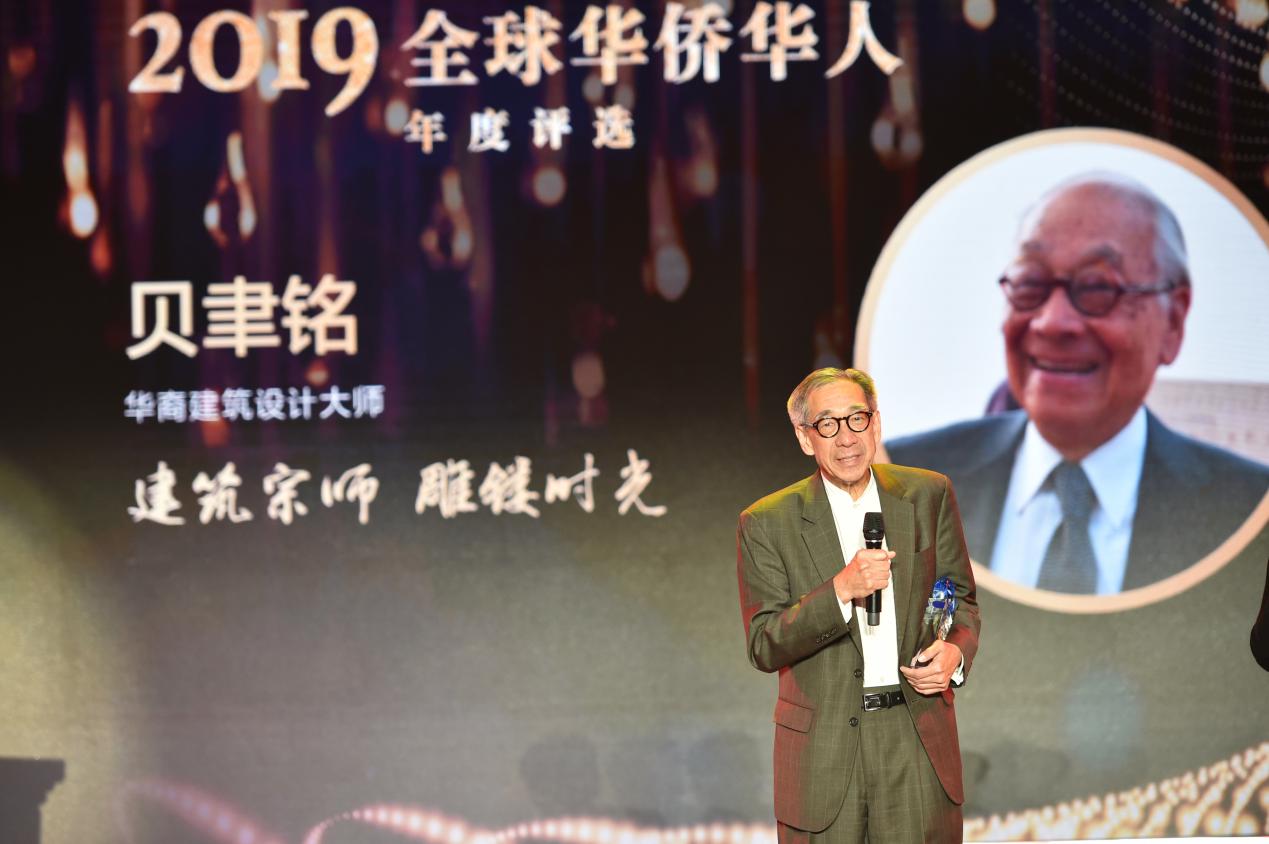 1月8日下午,“2019全球华侨华人年度评选颁奖典礼”在北京钓鱼台国宾馆芳菲苑举行,“年度人物”揭晓。图为全国人大华侨委员会副主任委员董中原为贝聿铭代表、贝聿铭之子贝建中颁奖。