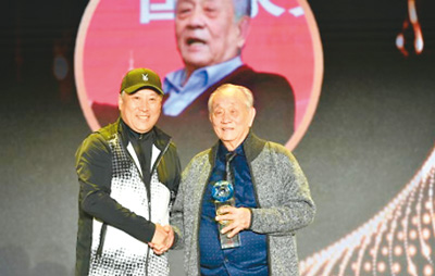 2019全球华侨华人年度评选颁奖典礼举行,王文教(右一)获评年度人物。中新社记者 翟璐 摄