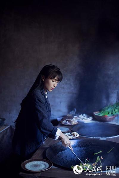 有一期主题讲年夜饭,她从起床开始忙碌:剪窗花、写对联、挂宫灯;腌鸡、剁肉、炒料、拔萝卜、掰白菜、拔蒜苗。她穿一件短款褂袄,深蓝色长裤,头发随意挽出一个髻,在井水边洗菜、摘菜,然后整整齐齐码在案头。
