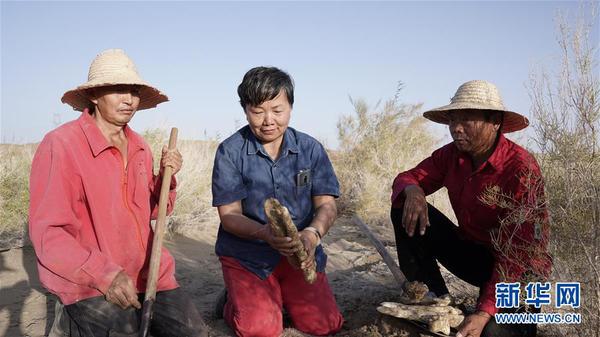 常青(中)在沙漠中的肉苁蓉种植示范和种子基地内进行采样(2019年9月27日摄)。 新华社记者 宿传义 摄