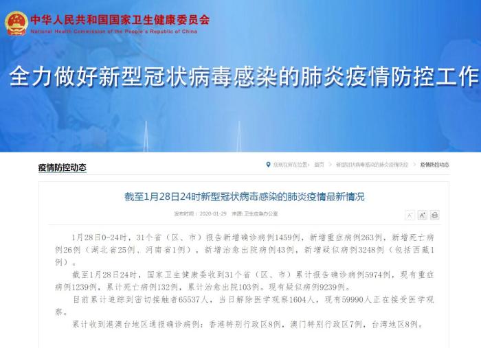截至1月28日24时,国家卫生健康委收到31个省(区、市)累计报告确诊病例5974例,现有重症病例1239例,累计死亡病例132例,累计治愈出院103例。现有疑似病例9239例。