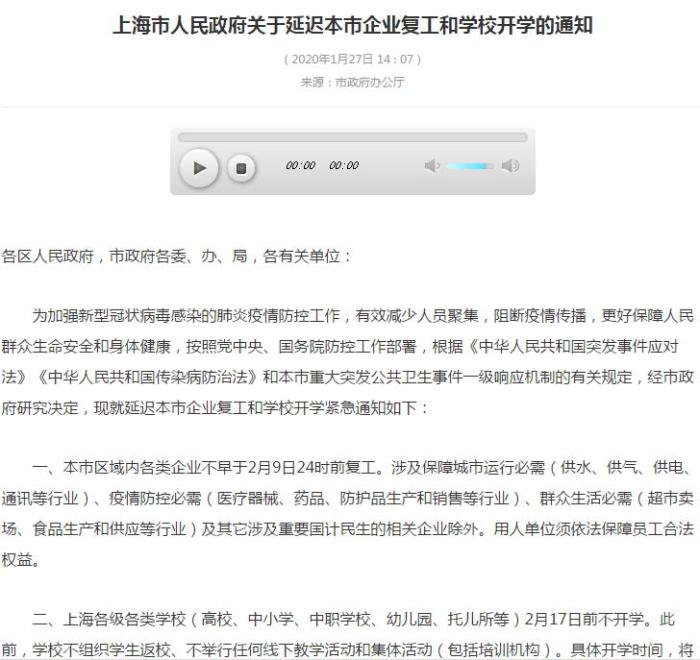 中新网客户端1月29日电(李金磊) 近日,上海、重庆、广东、江苏、浙江等省份发布关于延迟企业复工的通知,宣布各类企业不早于2月9日(正月十六)24时前复工。其中,上海人社局表示,延迟复工是出于疫情防控需要,这几天属于休息日。对于承担保障等任务上班的企业职工,应作为休息日加班给予补休或按规定支付两倍工资。