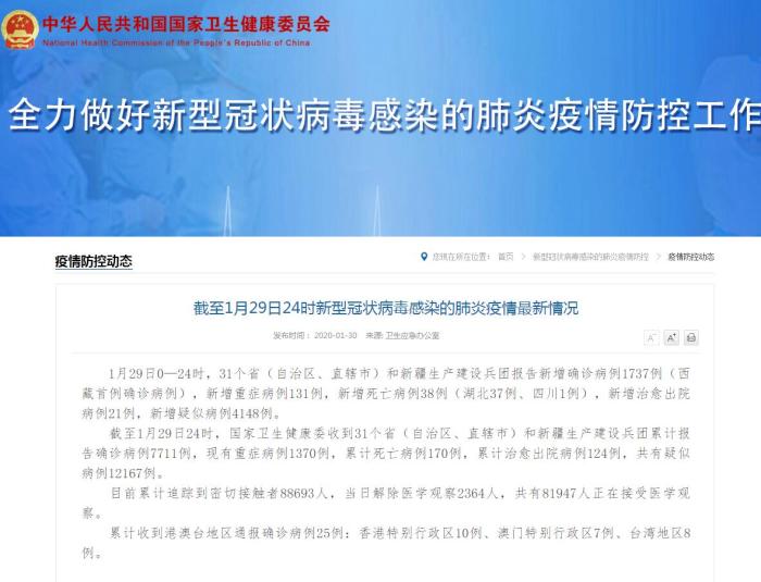 截至1月29日24时,国家卫生健康委收到31个省(自治区、直辖市)和新疆生产建设兵团累计报告确诊病例7711例,现有重症病例1370例,累计死亡病例170例,累计治愈出院病例124例,共有疑似病例12167例。