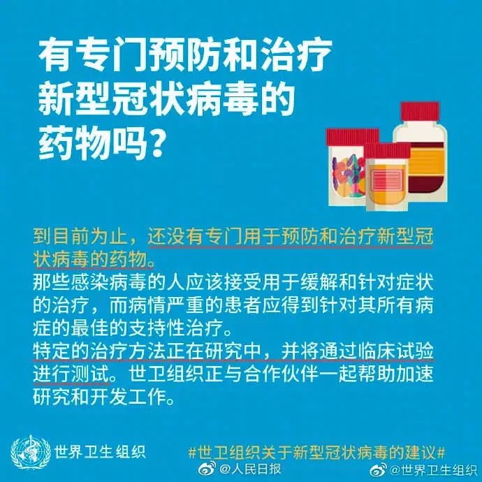 特别提醒:按照世界卫生组织 ,到目前为止,还没有用于预防和治疗新型冠状病毒的药物。特定的治疗方法正在研究中,并将通过临床试验进行测试。