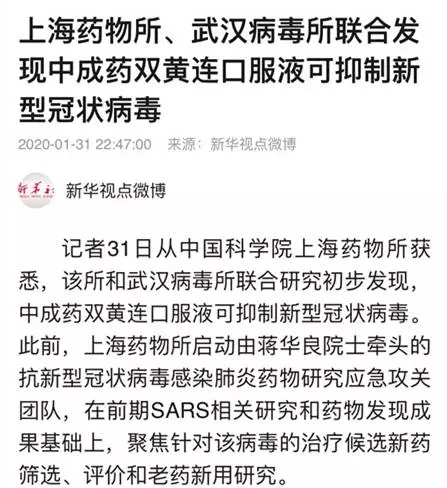 1月31日,新华社记者从中国科学院上海药物所获悉,该所和武汉病毒所联合研究初步发现,中成药双黄连口服液可抑制新型冠状病毒。目前该发现仍是初步研究,该药已在上海公共卫生临床中心、华中科技大学附属同济医院开展临床研究,对病人如何有效还要做大量的实验。