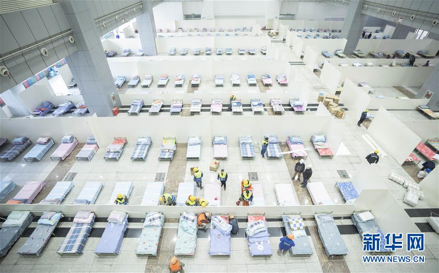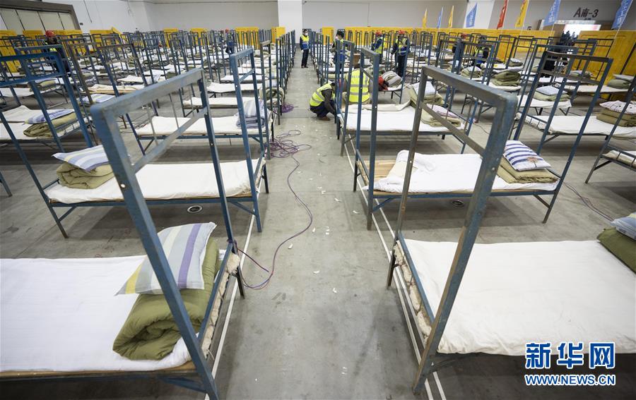 4 2月4日拍摄的改造中的武汉国际会展中心内部。 2月3日晚,3所“方舱医院”在武汉开建,至4日早上,已搭起数百张临时病床。这三处“方舱医院”位于武汉国际会展中心、洪山体育馆和武汉客厅,以收治新型冠状病毒感染的肺炎轻症患者为主,将提供3400张医疗床位。 新华社记者 才扬 摄