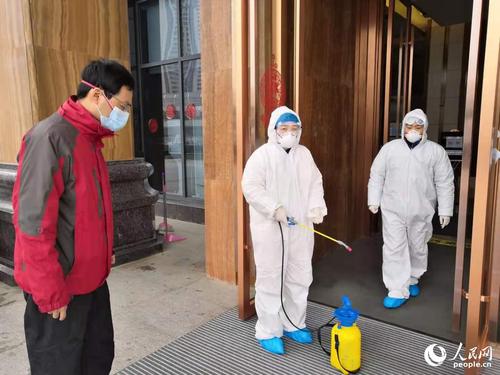 汉阳区隔离点外工作人员在消毒。人民网湖北频道郭婷婷摄