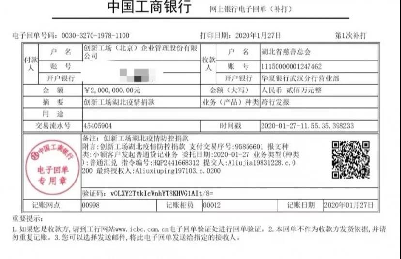 图为1月26日,民进会员企业(陶宁-创新工场)完成向湖北省慈善总会捐赠200万人民币,用于支援防控疫情和治疗疾病工作。