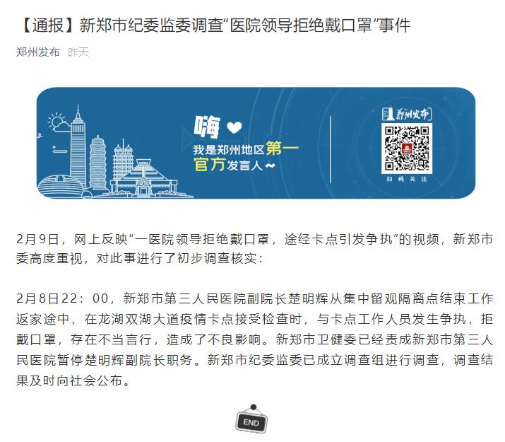 2月8日22:00,新郑市第三人民医院副院长楚明辉从集中留观隔离点结束工作返家途中,在龙湖双湖大道疫情卡点接受检查时,与卡点工作人员发生争执,拒戴口罩,存在不当言行,造成了不良影响。新郑市卫健委已经责成新郑市第三人民医院暂停楚明辉副院长职务。新郑市纪委监委已成立调查组进行调查,调查结果及时向社会公布。