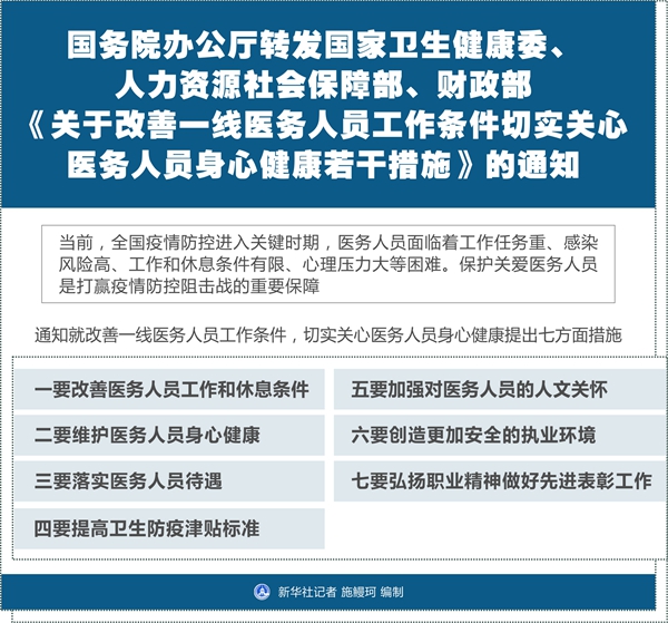 新华社北京2月11日电 2月11日,国务院办公厅转发国家卫生健康委、人力资源社会保障部、财政部《关于改善一线医务人员工作条件切实关心医务人员身心健康若干措施》的通知(以下简称通知)。
