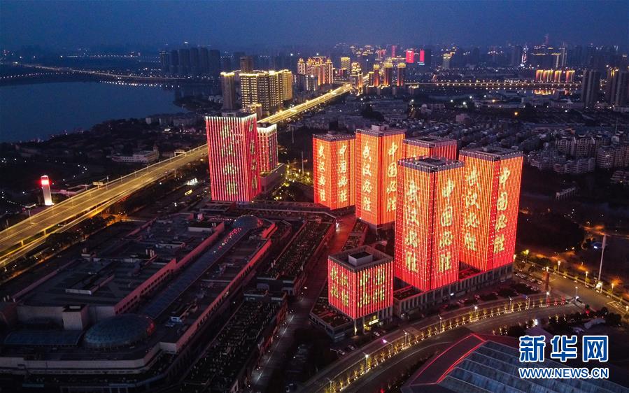 2月12日晚,武汉市江汉区西北湖附近的高层建筑上打出“武汉必胜”等标语。 新华社记者 王毓国 摄