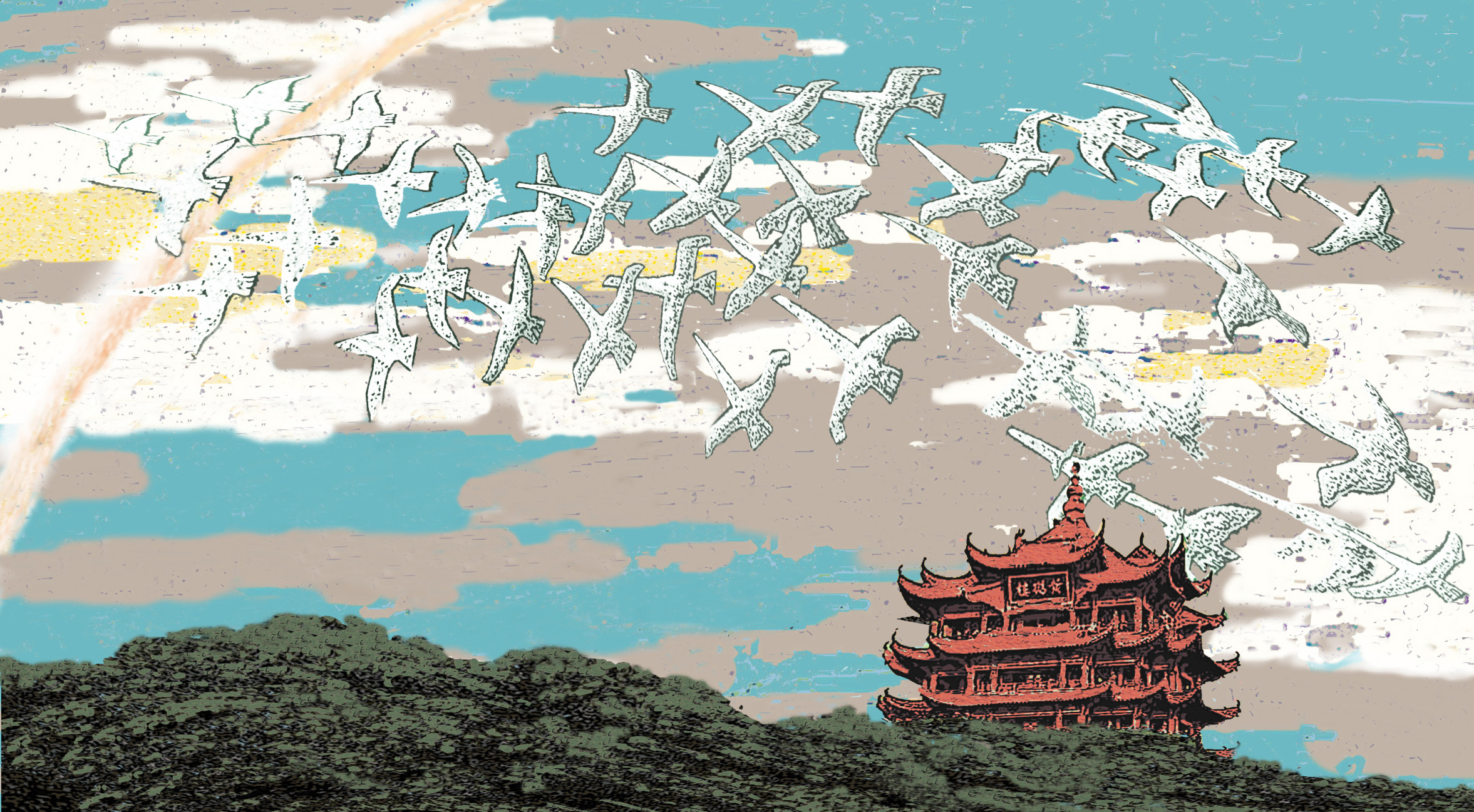 用笔尖记录下特殊时期战斗在一线的人和事,以此凝聚起抗击疫情的力量,这正是当下重庆民盟盟员的进行时。此刻,他们心中充满美好愿景,正如盟员艺术家李毅力与李永永合作的版画《风雨过后是彩虹》:一群白鹤正展翅飞过雨过天晴的黄鹤楼。