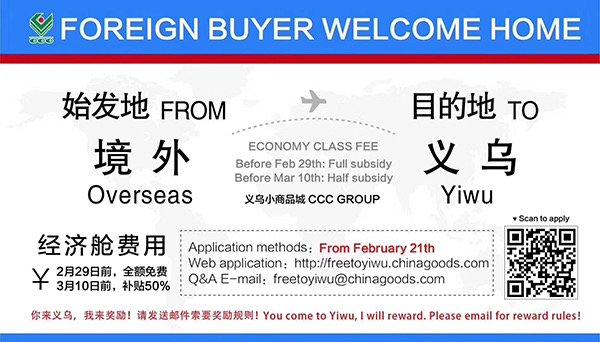 对于首次来义乌的外籍采购商(无义乌出入记录或采购记录),如果在3月10日前抵达义乌的,小商品城集团将指定酒店提供3日免费食宿。经义乌外贸企业或市场经营户事前备案、在抵达义乌15天内采购金额达5万美元以上的,可以享受非首次来义乌外商同等标准的航班补贴。