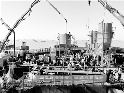 世界跨径第一的斜拉桥常泰大桥沉井日前开始浇筑混凝土。陶涛摄/光明图片