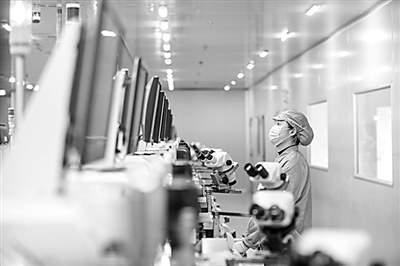 四川省遂宁市经开区蓝彩电子智能信息化车间,工人正在生产线开足马力加紧生产。刘昌松摄/光明图片