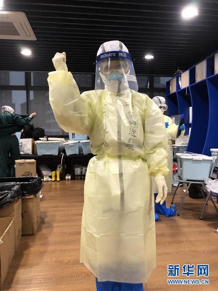 3月7日,孙继红在更衣室穿好层层防护服,戴上护目镜准备进舱工作。孙继红是在武汉市武昌洪山体育馆方舱医院负责护理病人的河北医疗队队员。新华社发
