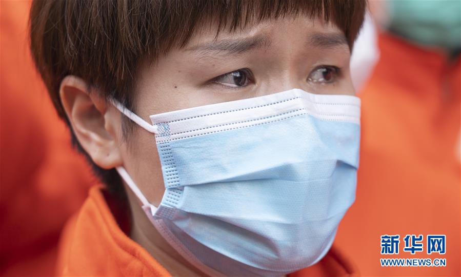 3月17日,在武汉市武昌区驻地,一名江西医疗队员在送别青海医疗队时热泪盈眶。青海医疗队当日返程,两家医疗队在同一个驻地也在同一个方舱共事,结下了深厚的感情。 当日,承担方舱医院医疗救治任务的援鄂医疗队陆续开始撤离。 新华社记者 才扬 摄