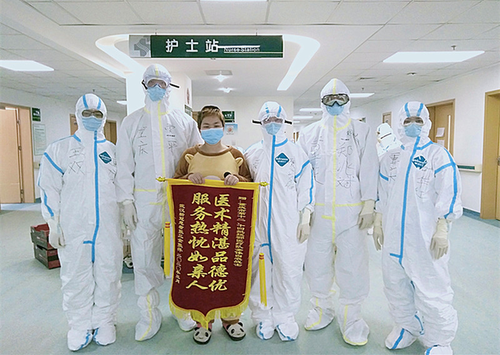 患者为王双(左一)所在医疗队送来锦旗