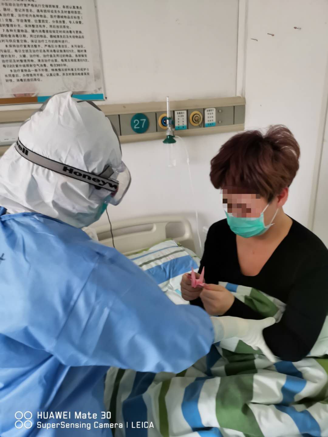 2月14日西方情人节那天,王晓嘉和同事利用休息时间叠了38个千纸鹤。每张千纸鹤上都写着“早日康复,节日快乐”,由于没有专业用纸,原本一个小时就可以完成的事情,她们叠了一下午。她说虽然是一只小小的纸鹤,但却承载了医疗队队员们无限的祝福,“希望大家好好配合,在我们的陪伴下坚强、乐观,一起战胜病魔!” 她回忆当天好多病人收到后都激动地哭了,“我们也是强忍着眼泪。”有病人出院后,将千纸鹤小心翼翼的装进了包里带回家。