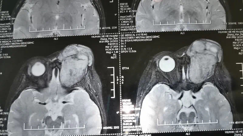 孩子4个月前有过一次眼部碰伤,在当地医院CT检查诊断为眶内血肿,先后两次抽出眶内积血,但是每次都稍有缓解,不久后就会复发。后来因为新冠肺炎疫情和武汉封城,没能及时就诊。这时,孩子的眼球突出已经非常严重,眼球全部突出于眼眶外,角膜暴露,视力丧失,由于极度的眶压升高十分痛苦,患儿哭闹不止。