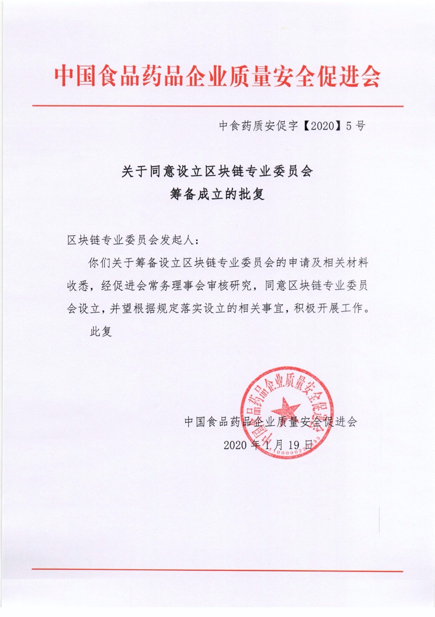 1月19日,经中国食品药品企业质量安全促进会批复同意,中国食品药品企业质量安全促进会区块链专业专委会正式成立(简称:中国食药区块链专委会,英文名:FDSA Blockchain Committee)。智度集团合伙人、智度智链董事长武楗棠先生任第一届会长,富力、程伟、宁家宏、施炳丰、刘兴亮、温凯、杨贞耐、胡继晔、刘新亮、李志生、赵云霞、任学任副会长,程远辉任秘书长,王鹏飞任执行秘书长,王海莹、张权、程勤任副秘书长,健康安全链(北京)企业管理有限公司为秘书长单位。专委会的成立得到会长单位北京智度智链科技有限责任公司,副会长单位大连富生天然药物开发有限公司、最美天气(上海) 科技有限公司、海南抹链网络科技有限公司、北京善之美医疗美容诊所有限公司等企业的支持。