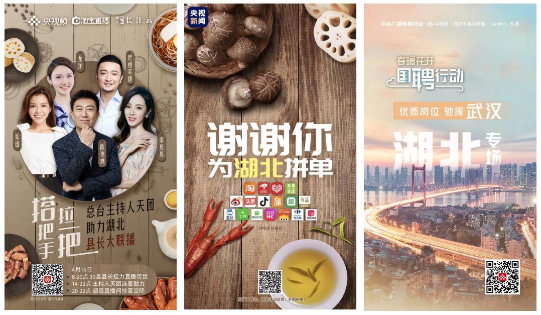 总台还发起了“搭把手、拉一把”“谢谢你为湖北拼单”以及“云招聘”湖北专场等活动,累计已在网上销售价值约4亿元的湖北农产品,为湖北应届毕业大学生提供近10万个就业岗位。