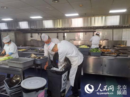 朝阳区政务服务局食堂师傅将其他垃圾倒入回收桶。人民网记者 高星 摄