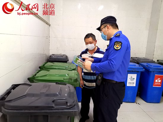 丰台区马家堡城管执法队员对商超内的垃圾收集场所进行了现场规范引导。丰台区城管委供图