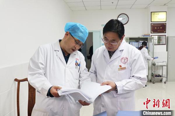 图为袁庆密检查科室各项建档资料情况。(右一为袁庆密) 陶亚荣 摄
