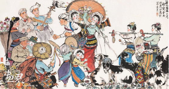 1956年6月,根据毛泽东主席的提议,周恩来总理在最高国务会议上提出在北京、上海两地各建立一个中国画院的设想,获得通过。8月,上海中国画院筹备委员会成立。程十发参加了上海中国画院的筹备工作,这是他艺术生涯的重要转折。上海中国画院吸收了民国以来以上海为中心的江南画坛最重要的中国画家为第一批画师,筹委会的成员有赖少其、傅抱石、潘天寿、唐云、王个簃、谢稚柳、刘海粟、伍蠡甫、吴湖帆、贺天健、陈秋草、沈尹默等,构成了中国画坛的半壁江山。他们中的好几位曾经是程十发在上海美专时的老师。能与这么多功成名就的大画家朝夕在一起工作和切磋,对于年轻的程十发而言是从天而降的机遇。当年,程十发就创作了工笔重彩《歌唱祖国的春天》,作品以人物为中近景,山水为远景,近处点缀花鸟,在独幅作品中显示出年轻画家的全科才能。该作获得了首届全国青年美展一等奖。如果说这一年调入画院是程十发进入高起点的、稳定的职业生涯的开始,那么1957年去云南的考察则将他的绘画创作带入了一个新世界,就此独辟蹊径,别开生面。这一年,程十发参加了国家文化部组织的云南德宏傣族景颇族自治州写生考察团。这是他第一次远离上海前往南疆边陲,奔放热烈的少数民族风土人情深深吸引了这位来自温润江南的画家,激发出他旺盛的创作欲。除了一连画了好几部少数民族题材的连环画之外,他还在中国画方面尝试少数民族题材。云南的采风,不仅使程十发获得了题材上的开拓,更是在画意和风格的塑造上挣脱了束缚走向自由。“我在创作方法上又有所不同的,不再拘泥于解剖、透视的束缚,而设法表现我从生活中感受来的意境,也注意到如何渲染和夸张形象诸问题?!背淌⒙有词底呦虮硐?。