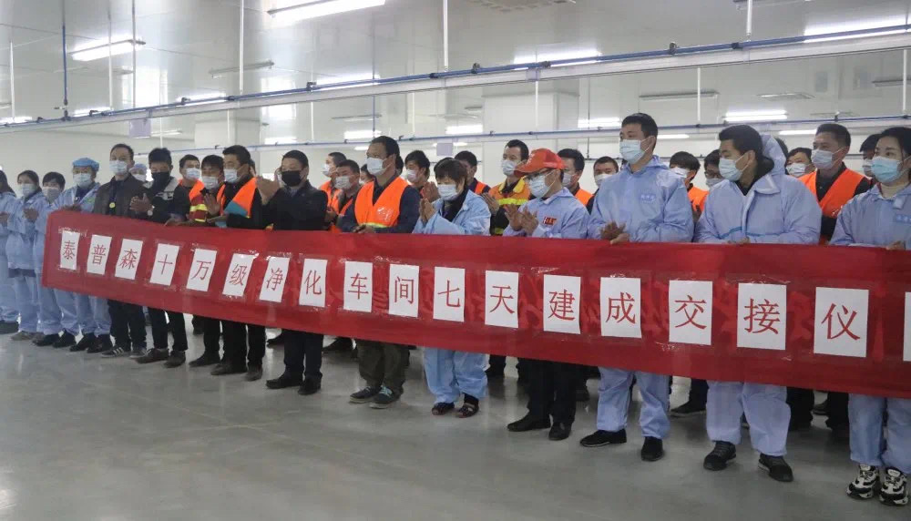 杨宝庆亲自挂帅,公司上下日夜奋战,用1天时间完成生产链布局和样品生产,两天时间形成3000件规模的试生产,7天时间完成了5000平方米的10万级净化车间的装修改造,9天时间生产了10万件防护服。