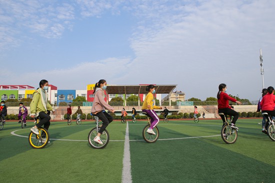 4月22日,江苏省淮安市洪泽湖实验小学的同学们在学习骑独轮车。人民视觉供图