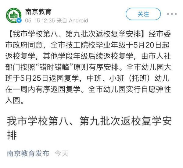 据南京市教育局发布消息:经市委市政府同意,全市技工院校毕业年级于5月20日起返校复学,其他学段年级后续返校复学,由市人社部门按照“错时错峰”原则有序安排。