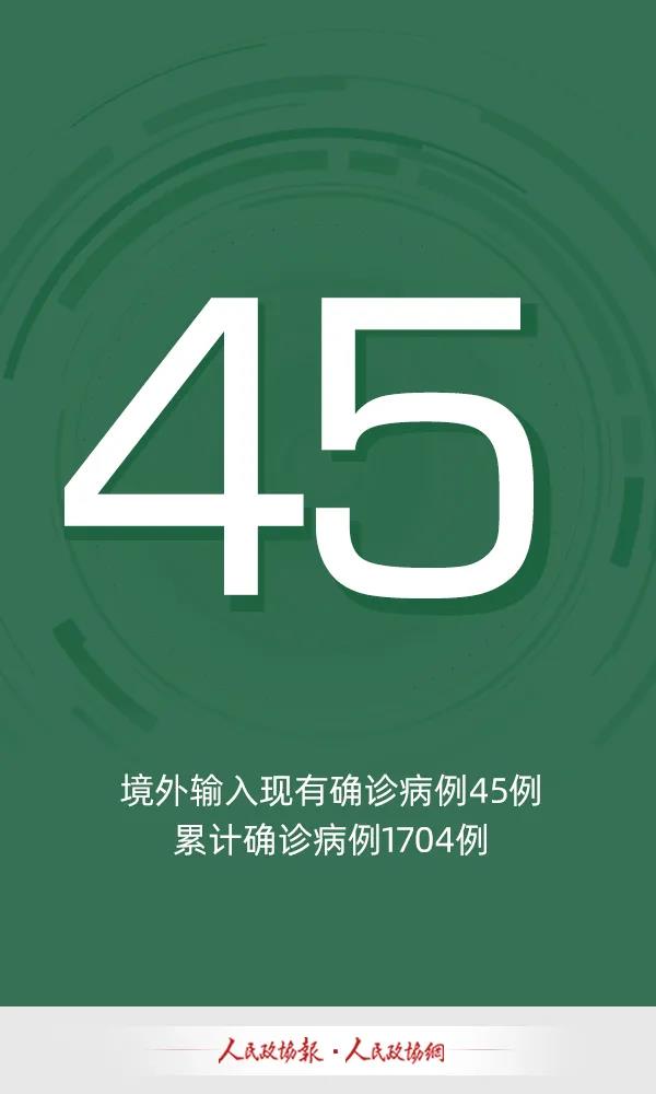 境外输入现有确诊病例45例(含重症病例2例),现有疑似病例4例。累计确诊病例1704例,累计治愈出院病例1659例,无死亡病例。