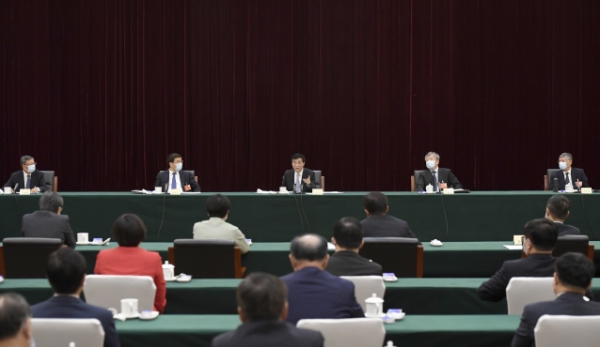 5月23日,中共中央政治局常委、中央书记处书记王沪宁看望出席全国政协十三届三次会议的体育界、医药卫生界委员并参加讨论。新华社记者 岳月伟 摄