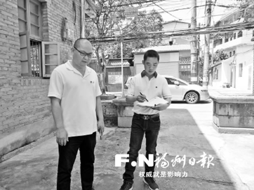 郑孝煌(左)调查路面下的生活污水排放情况。记者 欧阳进权 摄
