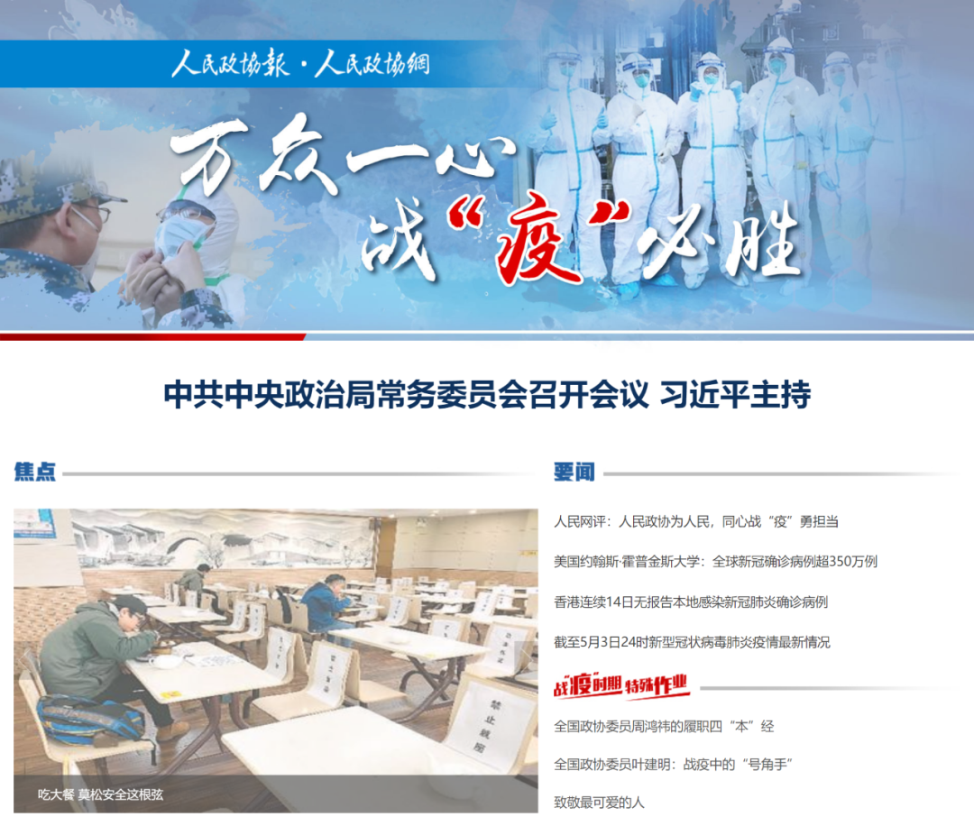 疫情期间,为彰显中央主流媒体的责任担当,确保疫情重大新闻实时报道,讲好统战政协系统的抗疫故事,我们迅速组织部门联动,加大融合报道力度,立足政协优势特色,推出了一系列权威“硬”新闻和温馨“暖”报道,亮点纷呈——在网页和政协号APP同步上线“万众一心 战‘疫’必胜”专题,时事要闻滚动推送;联合策划“战疫时期特殊作业”“第一书记在‘疫’线”“委员在‘疫’线”、战“疫”日记等栏目,同步在报网端微屏及所属新媒体平台落地,仅1月23日至3月19日期间,人民政协报微信公众号就推送稿件近1200篇,累计阅读量310余万,阅读量过万的稿件50篇,阅读量过10万+的稿件4篇;发起《中国医生,我想对您说……》活动,联动社会各界和一线医护人员隔空对话,共收到300多个短视频,200多份礼物照片,在抖音、快手、微视、央视频等短视频平台点击量超500万;开设独家视频栏目“连线‘疫’线”,高密度视频连线对话权威疫情防控专家委员,如全国政协委员、武汉协和医院院长胡豫,全国政协委员、北京医院院长王建业,全国政协委员、北京医院大内科主任孙铁英等,第一时间介绍“疫”线情况,传播更具价值的科学防控信息。