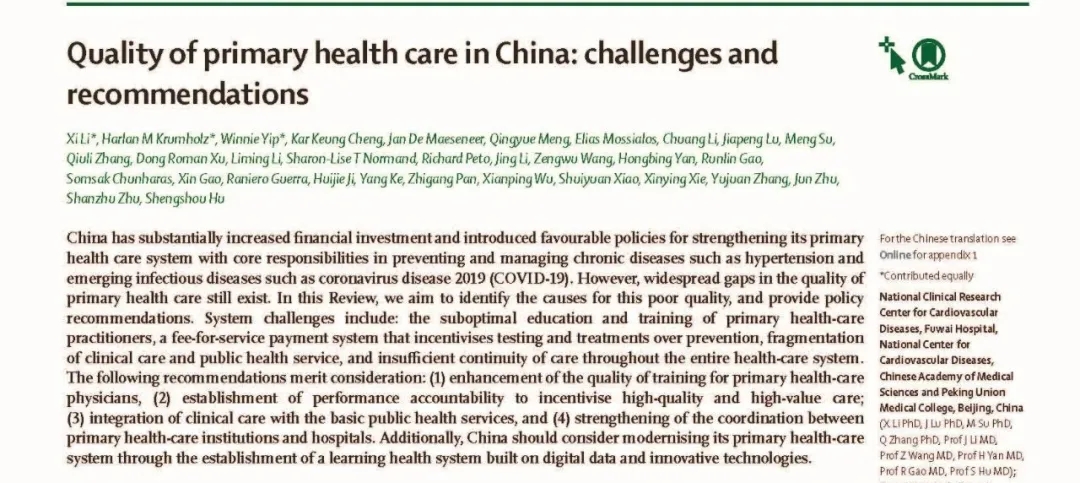 今天,国家心血管病中 心 中国医学科学院阜外医院团队关于我国基层医疗卫生服务质量的大型综述性文章在《柳叶刀》杂志发表。该文章从人力资源、信息技术、支付方式、服务整合和机构协同等方面系统分析了我国基层医疗卫生机构的服务质量面临的挑战,并提出针对性建议,为其在“健康中国”宏伟目标指引下发挥好疾病防控“奠基石”和民众健康“守门人”的作用提供了重要支撑。
