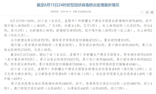 国家卫生健康委于16日在官网发布的《截至6月15日24时新型冠状病毒肺炎疫情最新情况》(以下简称“情况”)称,6月15日0—24时,31个?。ㄗ灾吻⒅毕绞校┖托陆ㄉ璞疟ǜ嫘略鋈氛锊±?0例,其中境外输入病例8例(上海3例,广东3例,内蒙古1例,辽宁1例),本土病例32例(北京27例,河北4例,四川1例);无新增死亡病例;新增疑似病例3例,其中境外输入病例1例(在上海),本土病例2例(均在北京)。当日新增治愈出院病例7例,解除医学观察的密切接触者225人,重症病例增加3例。境外输入现有确诊病例93例(无重症病例),现有疑似病例2例。累计确诊病例1845例,累计治愈出院病例1752例,无死亡病例。