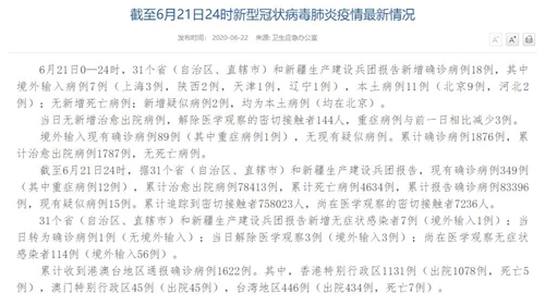国家卫生健康委于22日在官网发布的《截至6月21日24时新型冠状病毒肺炎疫情最新情况》(以下简称“情况”)称,6月21日0—24时,31个省(自治区、直辖市)和新疆生产建设兵团报告新增确诊病例18例,其中境外输入病例7例(上海3例,陕西2例,天津1例,辽宁1例),本土病例11例(北京9例,河北2例);无新增死亡病例;新增疑似病例2例,均为本土病例(均在北京)。当日无新增治愈出院病例,解除医学观察的密切接触者144人,重症病例与前一日相比减少3例。