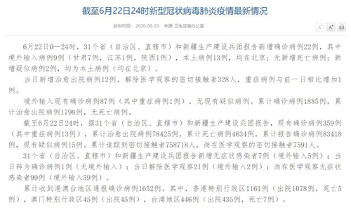 国家卫生健康委于23日在官网发布的《截至6月22日24时新型冠状病毒肺炎疫情最新情况》(以下简称“情况”)称,6月22日0—24时,31个省(自治区、直辖市)和新疆生产建设兵团报告新增确诊病例22例,其中境外输入病例9例(甘肃7例,江苏1例,陕西1例),本土病例13例,均在北京;无新增死亡病例;新增疑似病例2例,均为本土病例(均在北京)。当日新增治愈出院病例12例,解除医学观察的密切接触者328人,重症病例与前一日相比增加1例。境外输入现有确诊病例87例(其中重症病例1例),无现有疑似病例。累计确诊病例1885例,累计治愈出院病例1798例,无死亡病例。