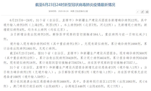 国家卫生健康委于24日在官网发布的《截至6月23日24时新型冠状病毒肺炎疫情最新情况》(以下简称“情况”)称,6月23日0—24时,31个?。ㄗ灾吻?、直辖市)和新疆生产建设兵团报告新增确诊病例12例,其中境外输入病例3例(上海2例,陕西1例),本土病例9例(北京7例,河北2例);无新增死亡病例;新增疑似病例4例,均为本土病例(均在北京)。当日新增治愈出院病例3例,解除医学观察的密切接触者584人,重症病例与前一日相比减少1例。境外输入现有确诊病例87例(其中重症病例1例),无现有疑似病例。累计确诊病例1888例,累计治愈出院病例1801例,无死亡病例。