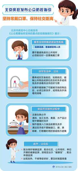 北京市疾控中心日前发布《公众需要始终坚持的重点防控措施指引》,提示应坚持常戴口罩,保持社交距离,保持手卫生,配合做好健康监测,做好饮食卫生,做好日常清洁和消毒。